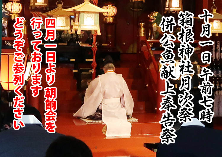 ◆9月1日午前7時斎行の箱根神社月次祭(つきなみさい)のご案内です。 皆様方のご参列をお待ち申し上げます。 尚、4月1日より朝餉会を行っております。 朝餉会では神様にお供えしたお米で作ったお粥をいただき、直会を行います。…